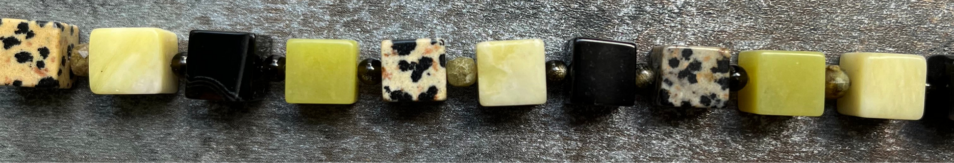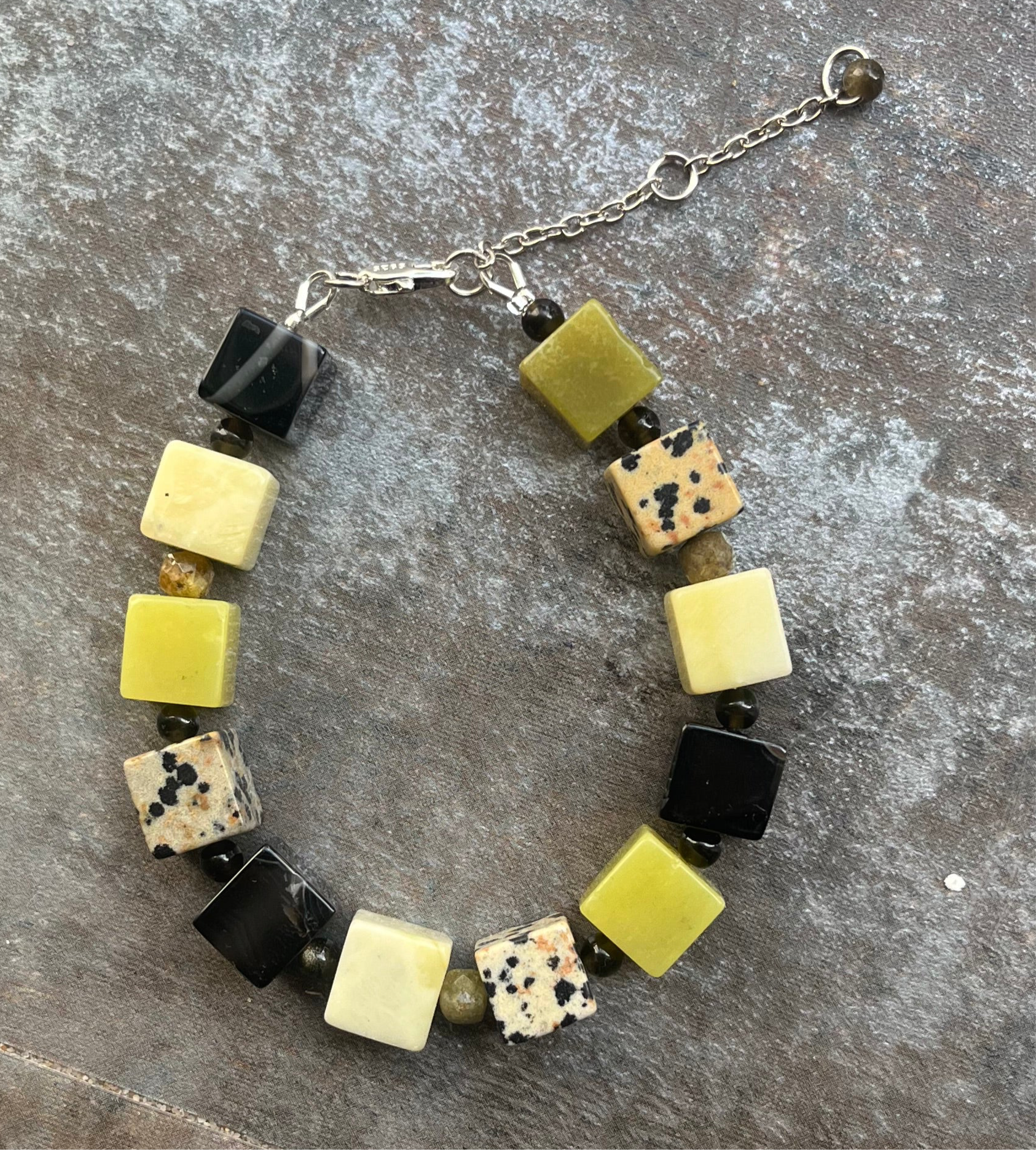 • Handmade Armband mit quadratischem Onyx, Dalmatiner Jaspis und Serpentin