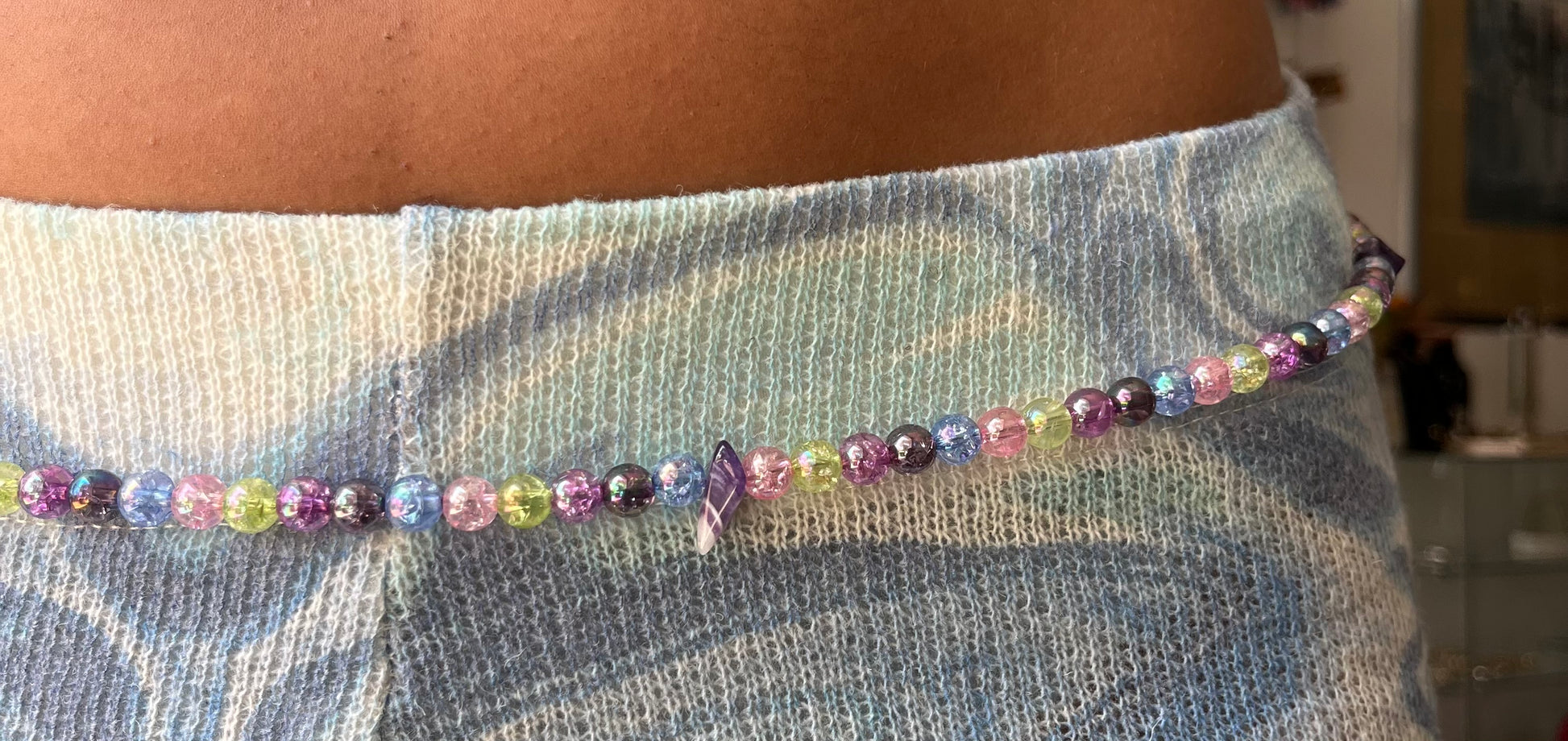 • mit bunt glitzernden Perlen + kleinen Amethyst-Schmucksteinen