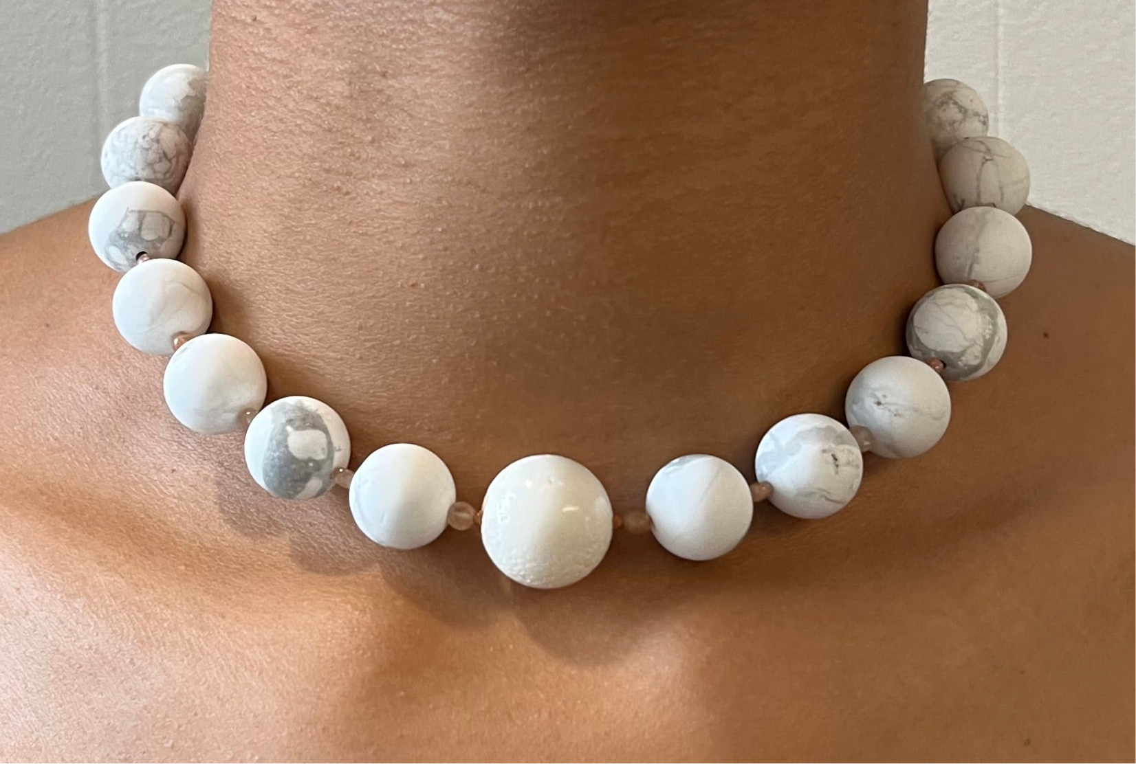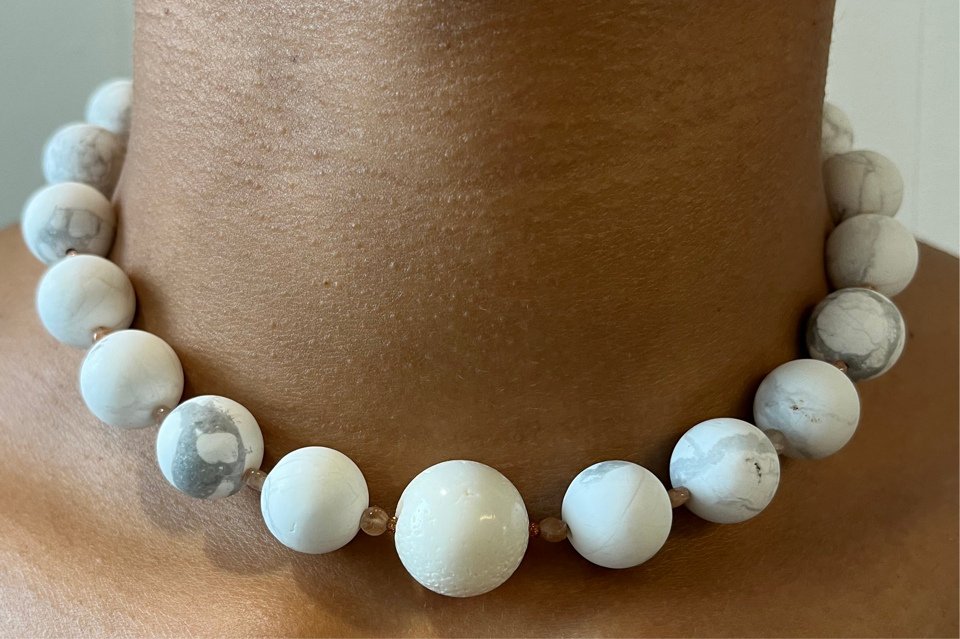 • Schöne, chunky Halskette mit Perlen aus Howlith, Erdbeerquarz und Koralle