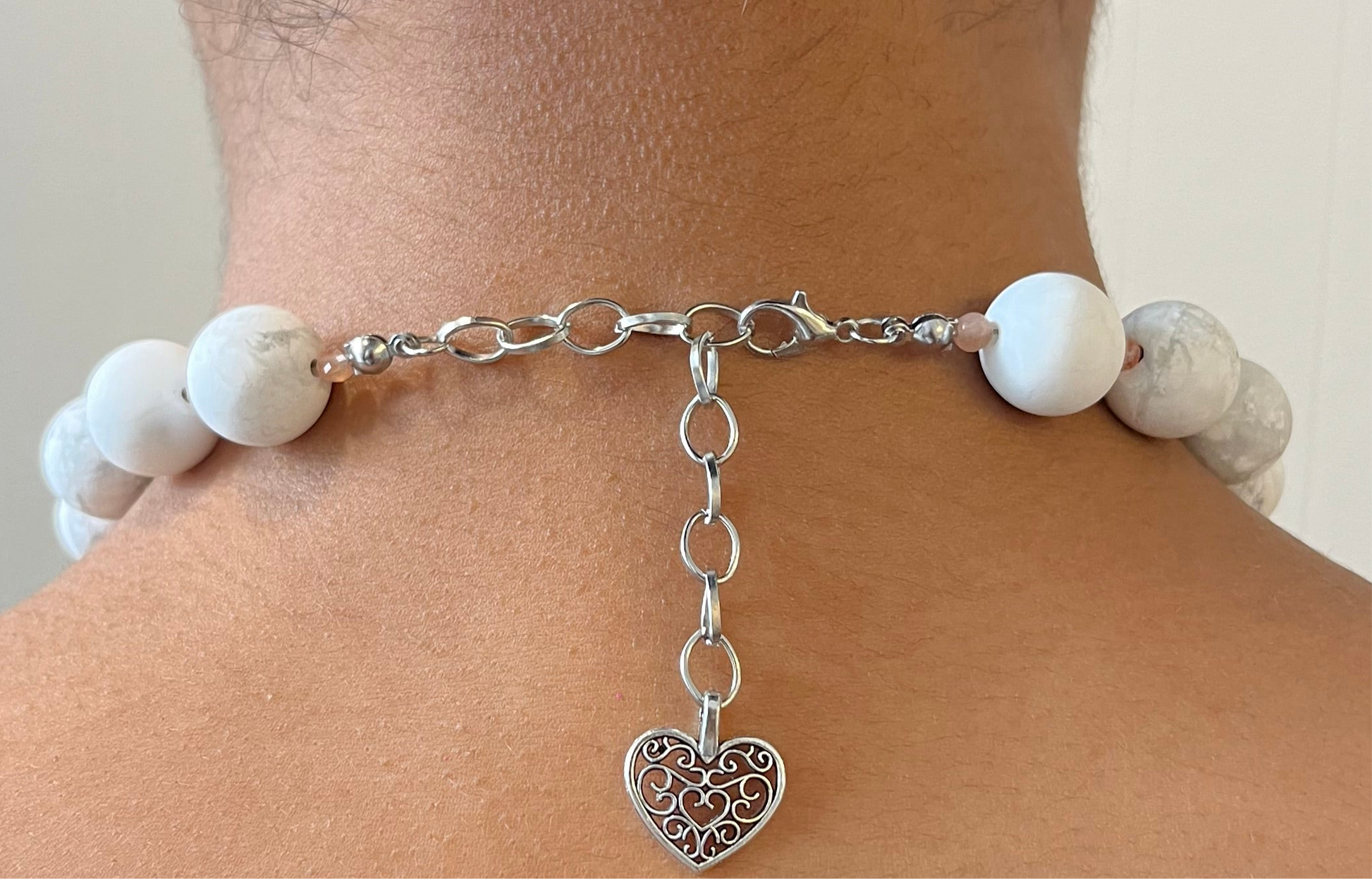 Unikat Handgemachte Halskette mit Howlith, Erdbeerquarz und Koralle