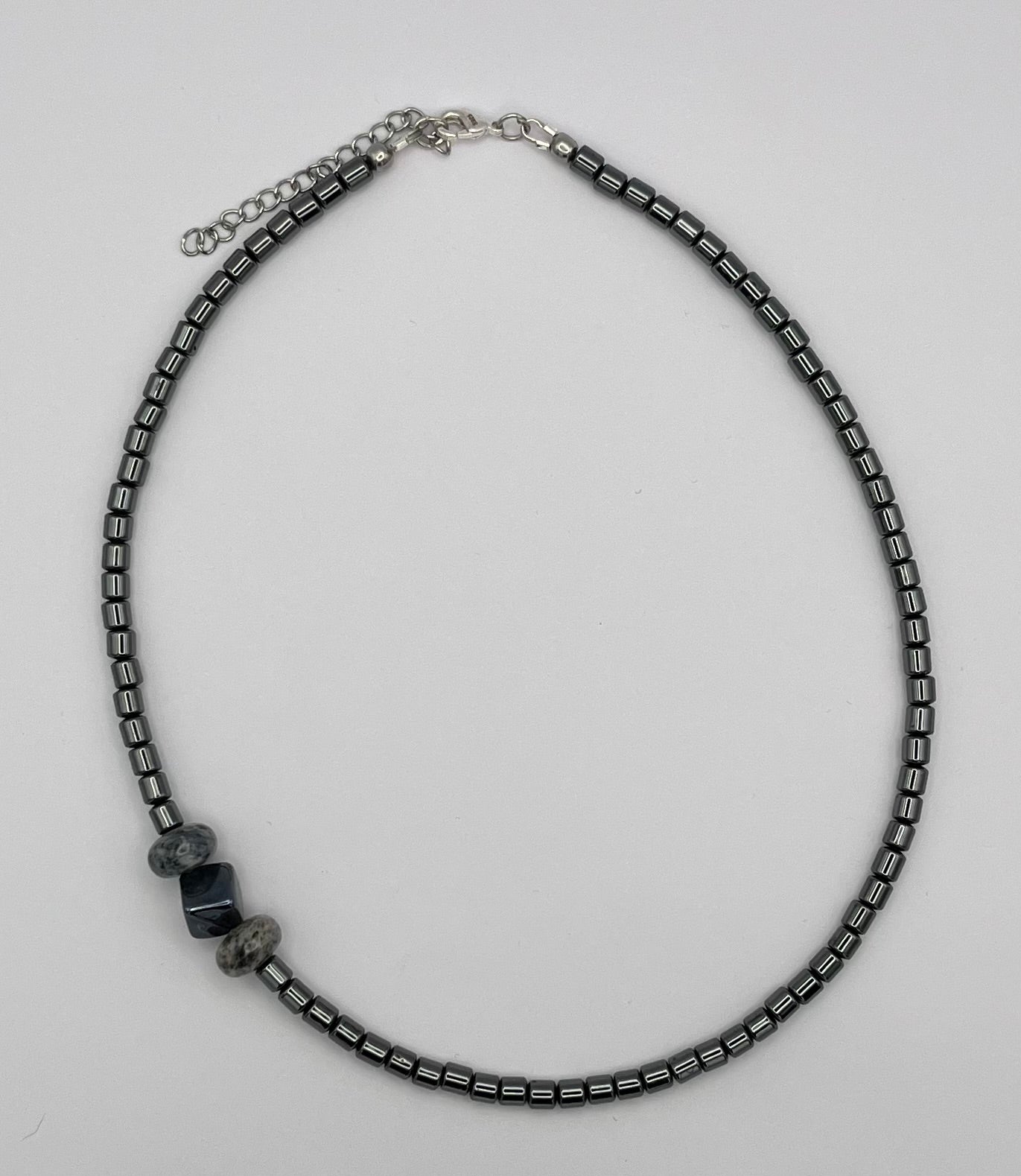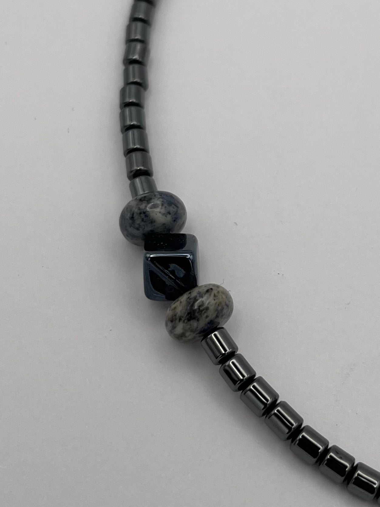 • Handgemachte Hämatit Kette mit würfelförmiger Perle und zwei Edelsteinen