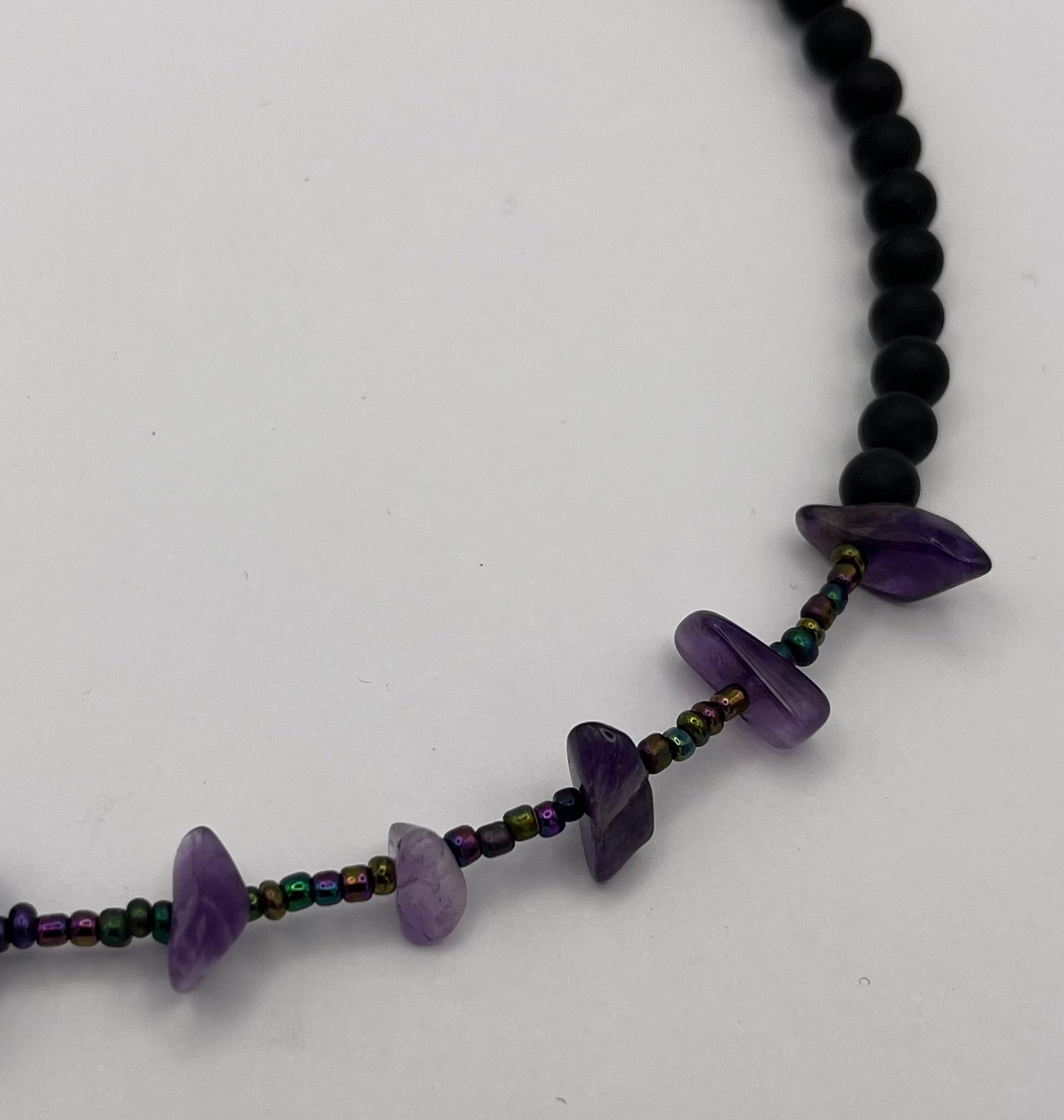 • Schöne asymmetrische Halskette mit Onyxperlen, Amethysten und kleinen metallisch-schimmernden Rocailles.