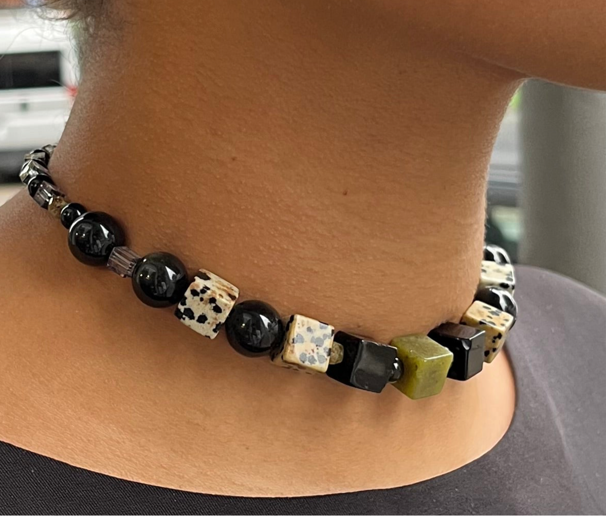 • Eine ausgefallene Halskette, welche nicht nur durch ihre verschiedenen Formen auffällt, sondern auch durch die wunderschöne Vielfalt an Edelsteinen wie zB. der Dalmatiner Jaspis mit außergewöhnlichem Muster oder der glänzende Obsidian