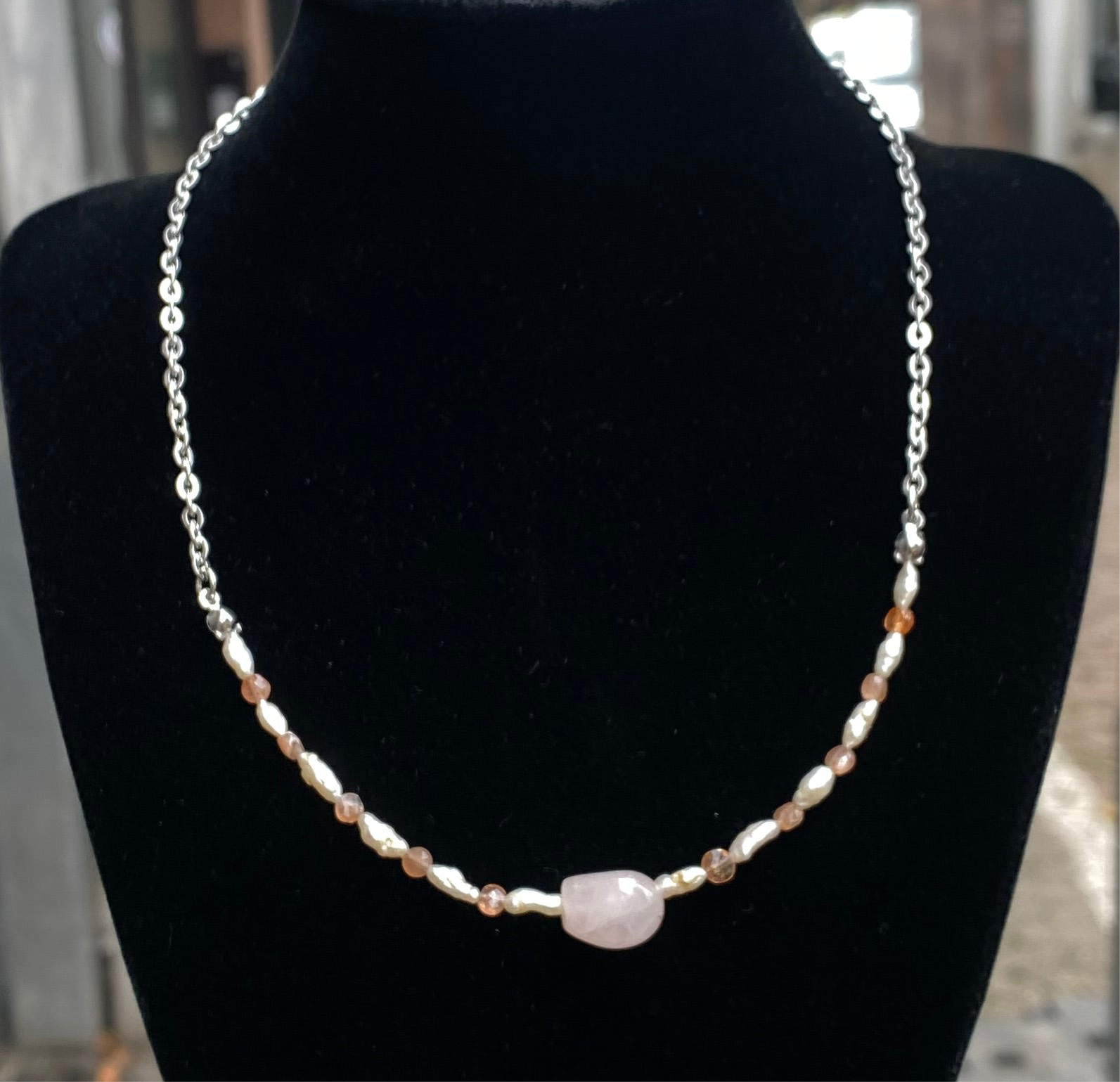 Zarte Kette mit Perlen, Erdbeerquarz und Rosenquarz