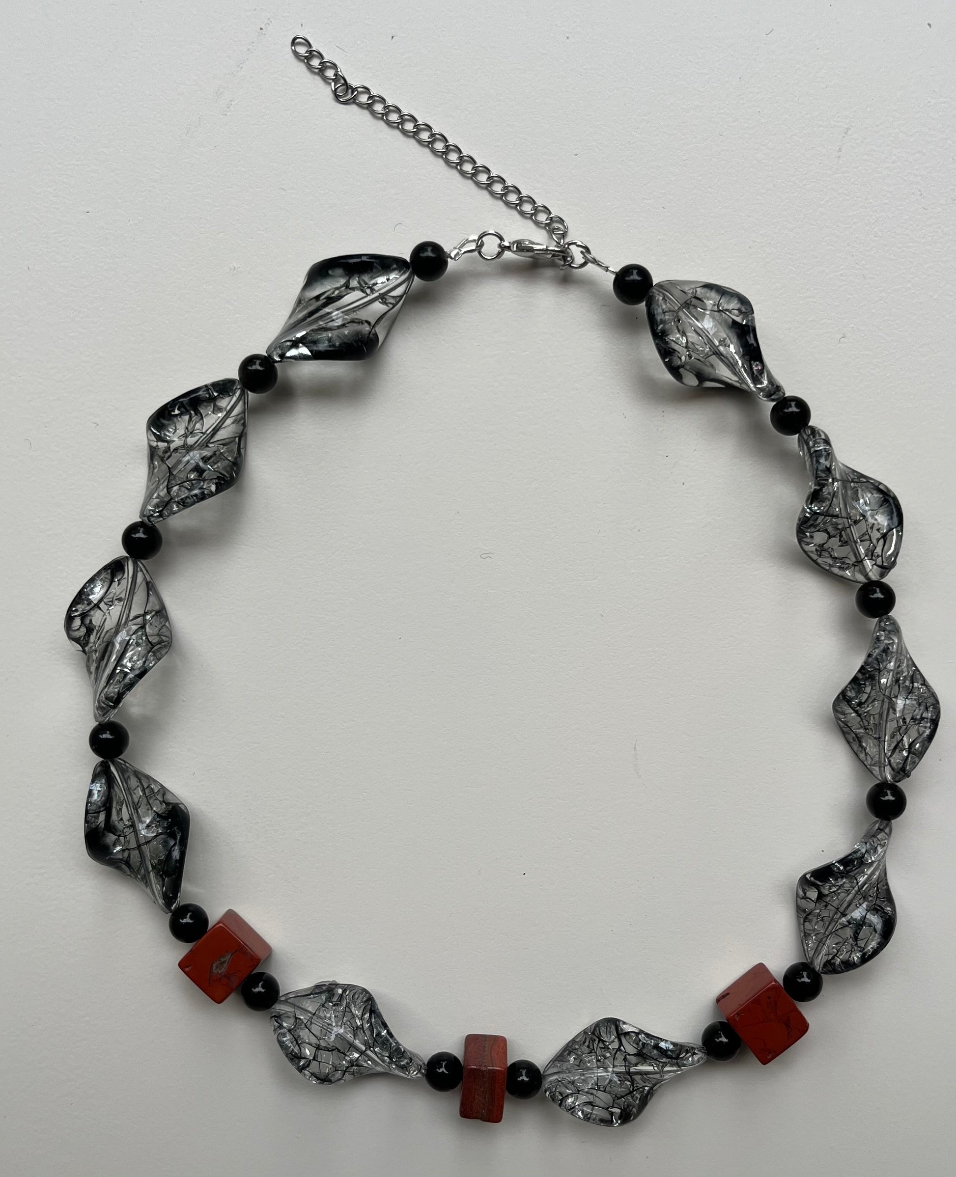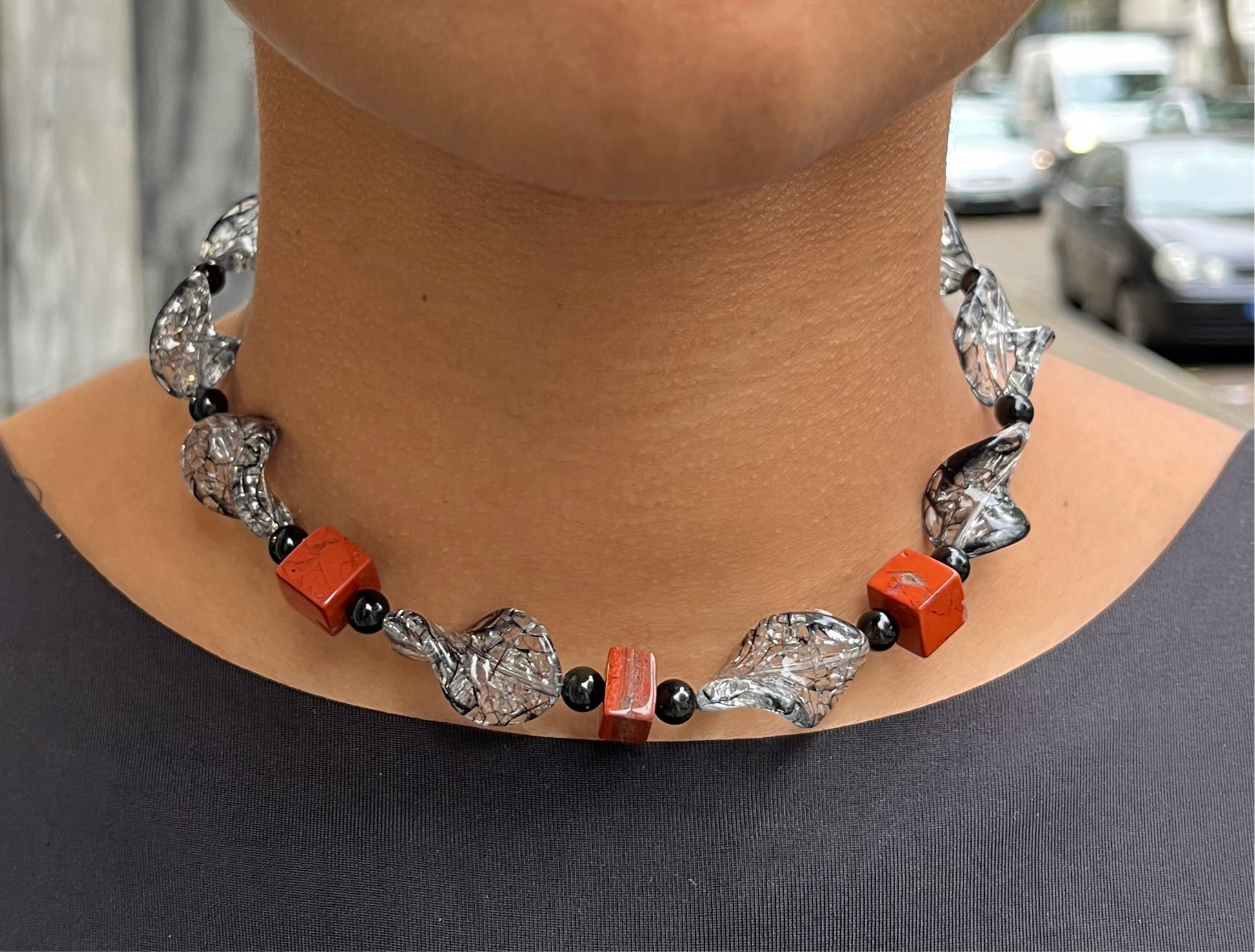 • Diese hübsche Halskette ist ein echter Hingucker mit ungewöhnlich geschwungenen Perlen, sowie wunderschönen Edelsteinen