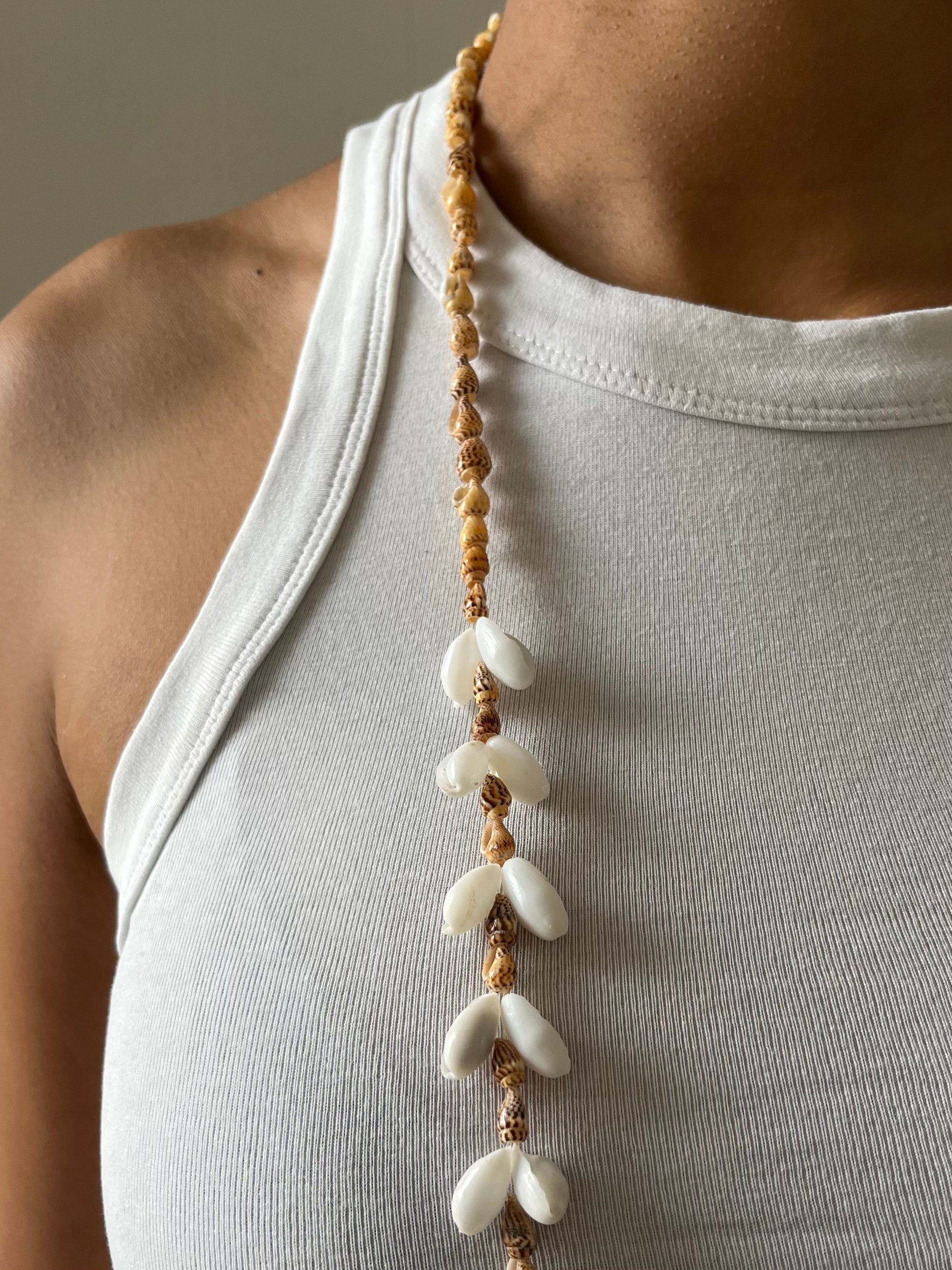 • Lange Boho Kette mit kleinen und großen Kauri Muscheln in verschiedener Farbe/Muster (da Naturprodukt)