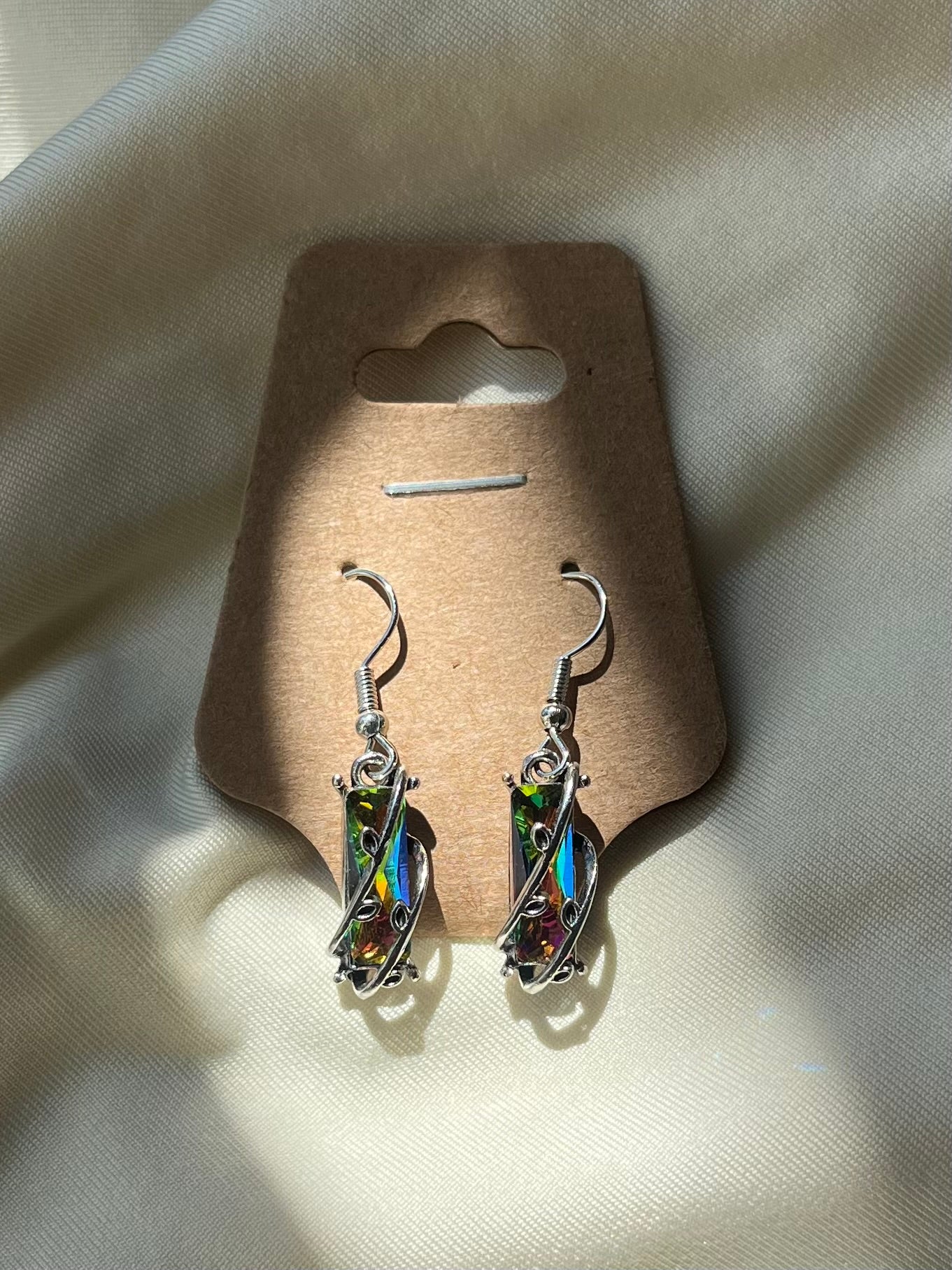 • verspielte Vintage Ohrringe mit rechteckigem, regenbogenfarbenen Glitzerstein und silbernen Ranken