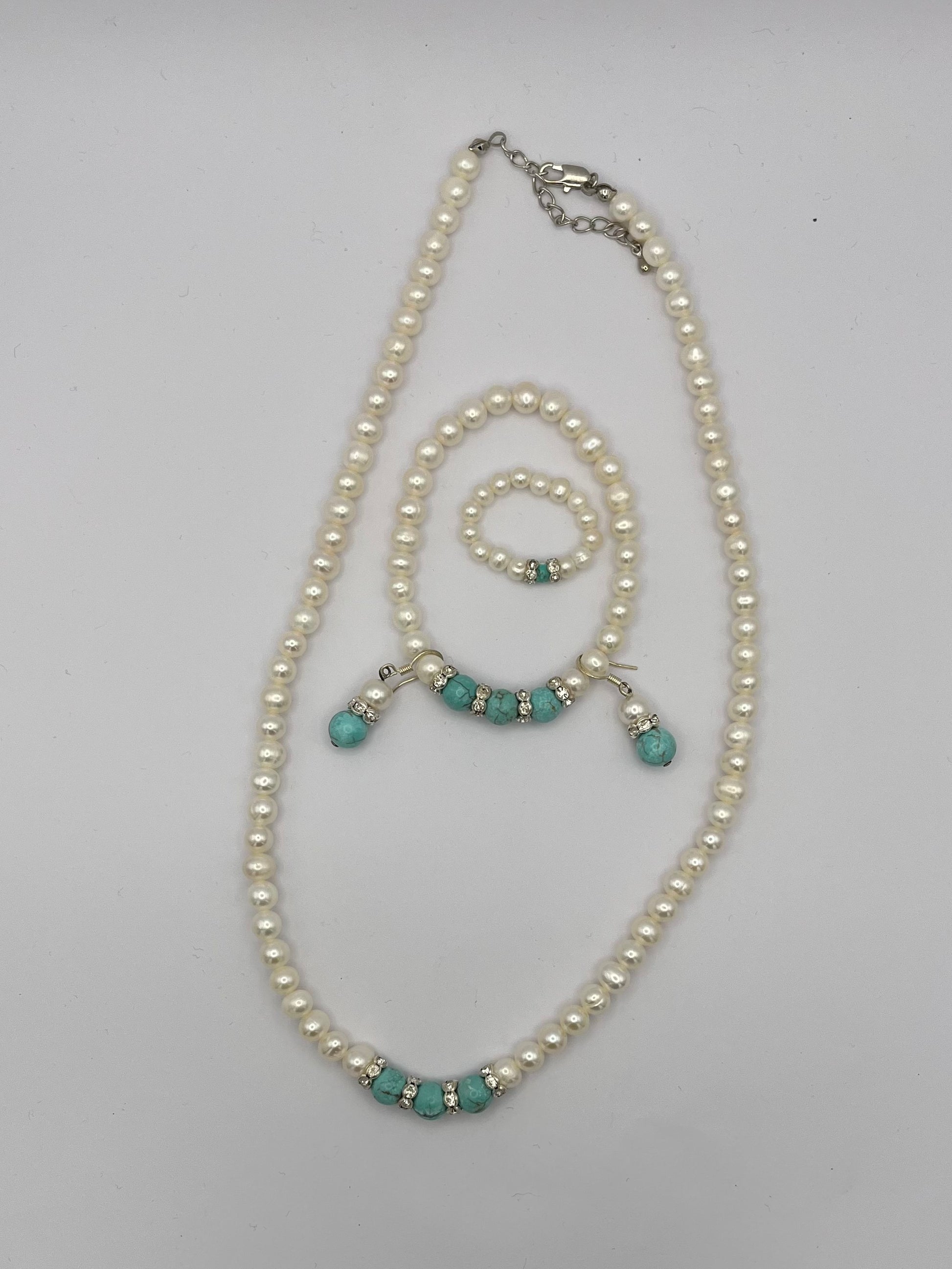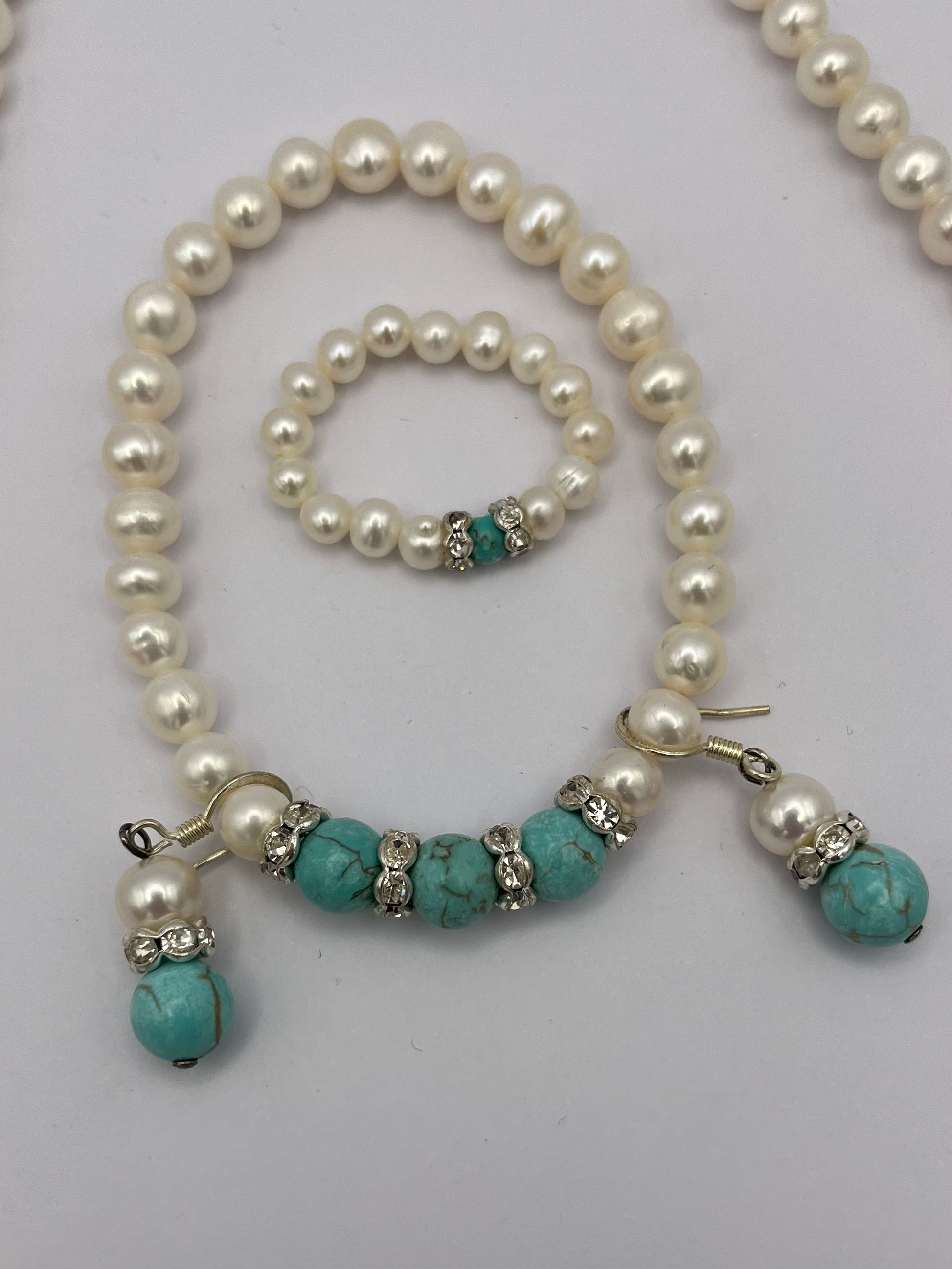 • mit türkisen und weißen Perlen