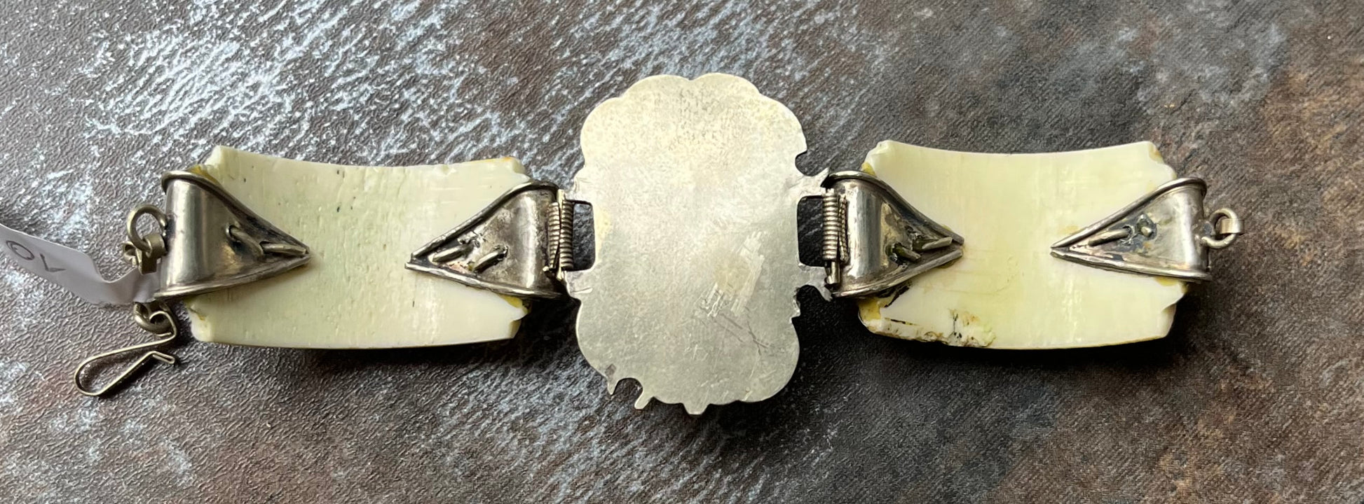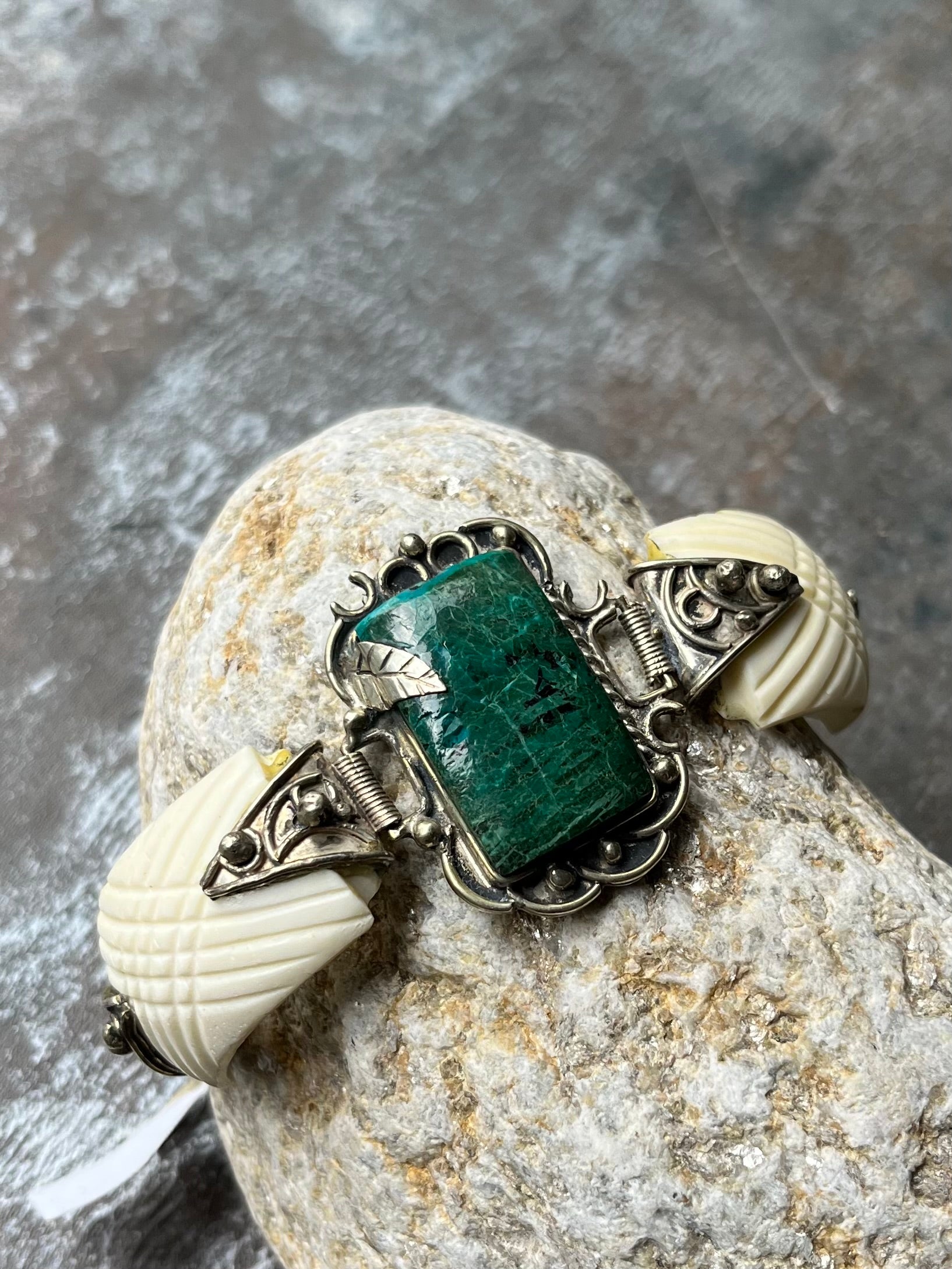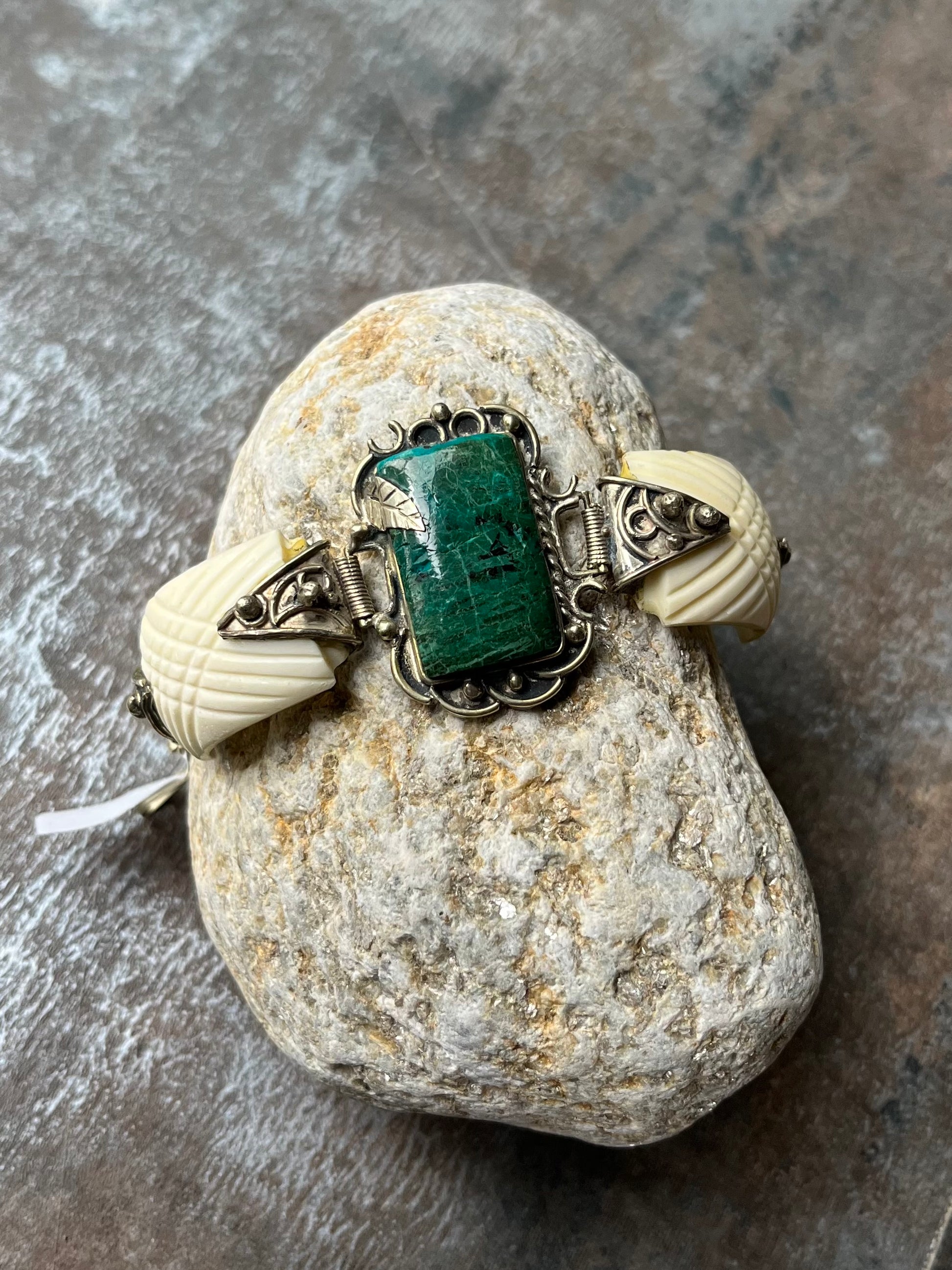 • Vintage Armband mit großem grünem Schmuckstein sowie metallischen Details und einem Band bestehend aus zwei Elfenbeinfarbenen Gliedern
